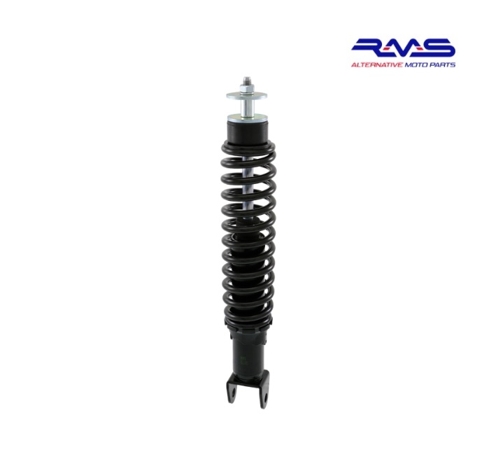 Amortiguador Piaggio RMS. Esta suspensión tanto trasera como delantera, es válida para motores Piaggio, montada en motos como Gilera Runner, Typhoon, NRG, Zip SP, entre otras. Tiene una longitud de 340mm y un diámetro de acoplamiento superior a 8mm. Color negro.