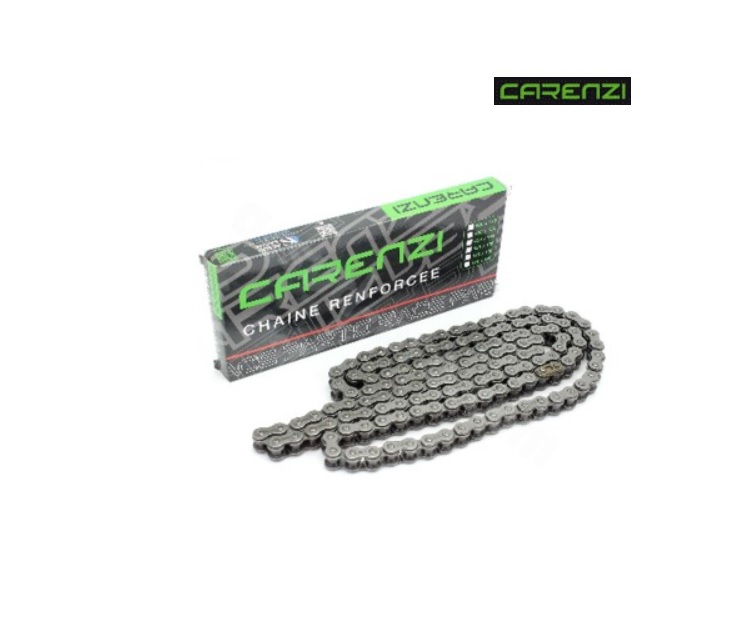 Cadena transmisión Carenzi 420 136 eslabones. Esta cadena reforzada del fabricante Carenzi es válida para casi todas las motos de 49cc y 125cc, como Derbi Senda, DRD Pro, XTreme, XRace, Rieju R, Rieju RR, Rieju MRT, Beta, Beta RRT, Trueba, XSeries, Yamaha DT, Husqvarna, Pitbike, Malcor, KTM, Gas Gas, etc. Color cromado.
