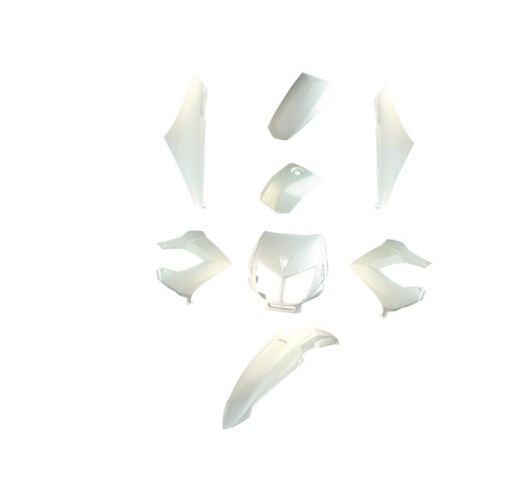 Carenado Derbi Senda 2000-2010 8 piezas blanco. Este kit de carcasas, cachas o plásticos es válido para Derbi Senda. El juego está compuesto por 8 piezas: careta, guardabarros delantero, tapas laterales delanteras y traseras, colín y tapa depósito gasolina. Color blanco.