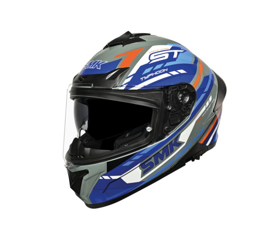 Casco SMK Typhoon sports tourer decorado mate. Este casco integral aporta calidad y un diseño de carcasa compacto y aerodinámico. Presenta ventilación en el área de la boca, en los costados y en la parte superior, ideal para viajes largos. Incluye pantalla larga incolora con tratamiento anti rayas preequipada con Pinlock 70 y una pantalla solar interior con tratamiento anti-UV. Tiene una gama de colores actual que podrás combinar con tu moto y equipación.