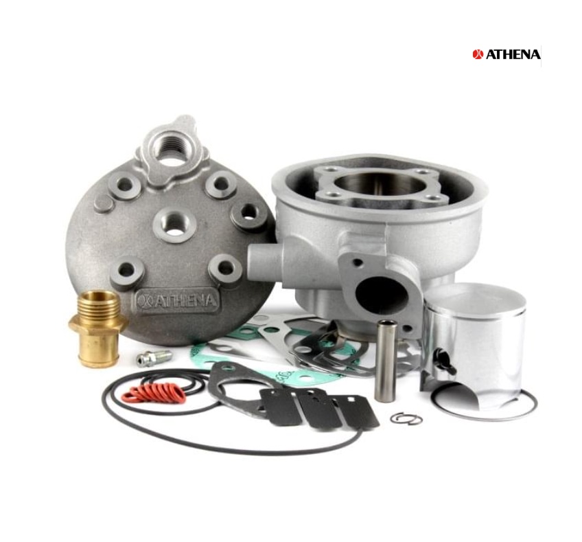 Cilindro Athena 70cc Minarelli Horizontal LC Bulón 10mm. Este cilindro del fabricante Athena es válido para motores Minarelli Horizontal con refrigeración por agua, montado en motos como Yamaha Jog R/RR, Aerox, Beta ARK, entre otras. Este kit incluye: cilindro fabricando en aluminio de 5 transfer y salida de escape trapezoidal, pistón, bulón 10mm, clips, segmento, juego de juntas, láminas y culata. Este cilindro es ideal para preparaciones, ya que nos ofrece un buen rendimiento al ser tipo sport.