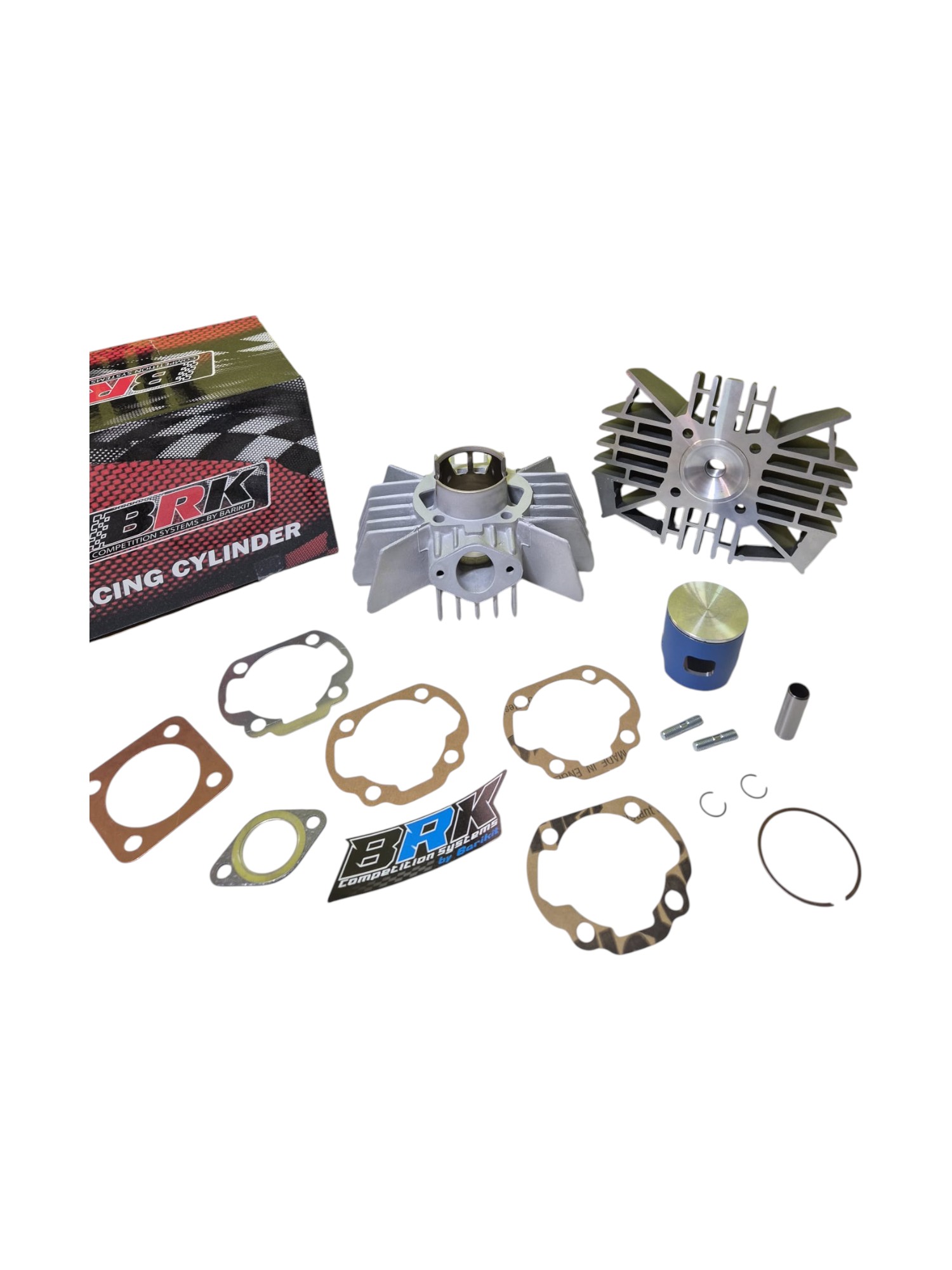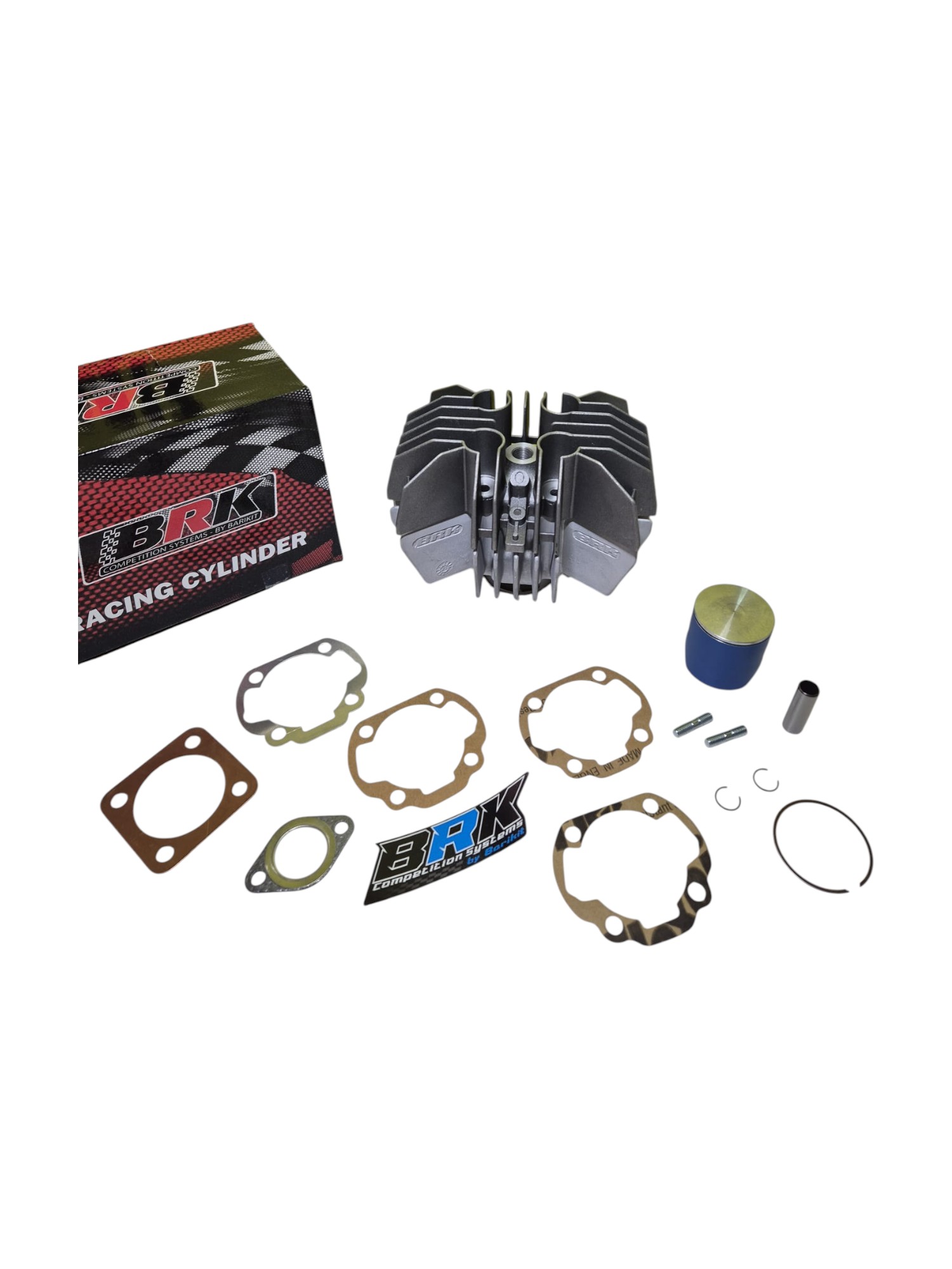 Características del cilindro: está fabricado en aluminio con revestimiento interior de nicasil, los que garantiza una mayor durabilidad, tiene un diámetro de 47,6mm combinado con la carrera original del motor, elevando la cilindrada a 74cc. Cuenta con 6 transfers de carga y lumbrera de escape con tabique central y dos boosters. De este modo, la evacuación de gases es más rápida, consiguiendo así una potencia elevada y un alto régimen de revoluciones. Además, el pistón de mono-segmento (un solo aro) minimiza la fricción y el nuevo acabado en azul mejor la duración durante el rodaje y reduce la posibilidad de gripaje.