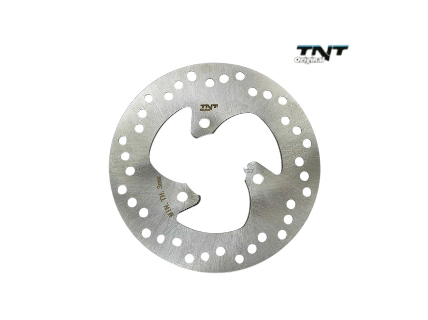 Disco freno Jog/Neos/Aerox 190mm TNT. Este disco de freno delantero de la marca TNT, destaca por la gran calidad del material con el que está fabricado. Es un recambio similar al original. Presenta las siguientes medidas: diámetro exterior 190mm, diámetro interior 58mm, grosor 3,55mm, 3 agujeros de 8,5mm de diámetro. Es montado en motos como Yamaha Jog R/RR, Aerox, Neo’s, Beta ARK, entre otras.