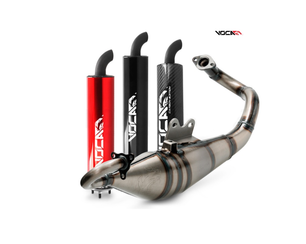 Tubo escape Voca Racing Piaggio Sabotage. Este escape del fabricante voca es válido para cilindros de 50cc, pero también se puede montar para cilindrada de 70cc o cilindro Sport si quitas el tope de la boquilla, ya que así desarrolla toda su potencia. Este escape es válido para motores Piaggio, como Piaggio Zip SP, Typhoon, NRG, entre otras.