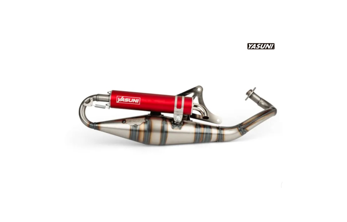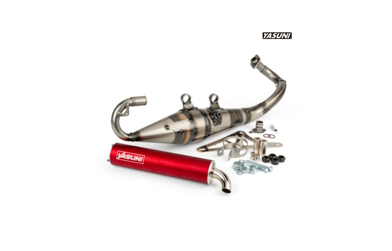Tubo escape Yasuni R Pro Piaggio silencioso rojo. Este novedoso tubo de escape Yasuni R es válido para todos los motores Piaggio, tanto refrigeración por aire, como por agua, por ejemplo, Piaggio Zip, Gilera, Typhoon, entre otras. Es ideal para motores de 49cc y 70cc. Para un mejor funcionamiento, se recomienda montar con un carburador de 17,5. Este escape está homologado para ITV (contiene certificado de homologación). Con silencioso rojo.