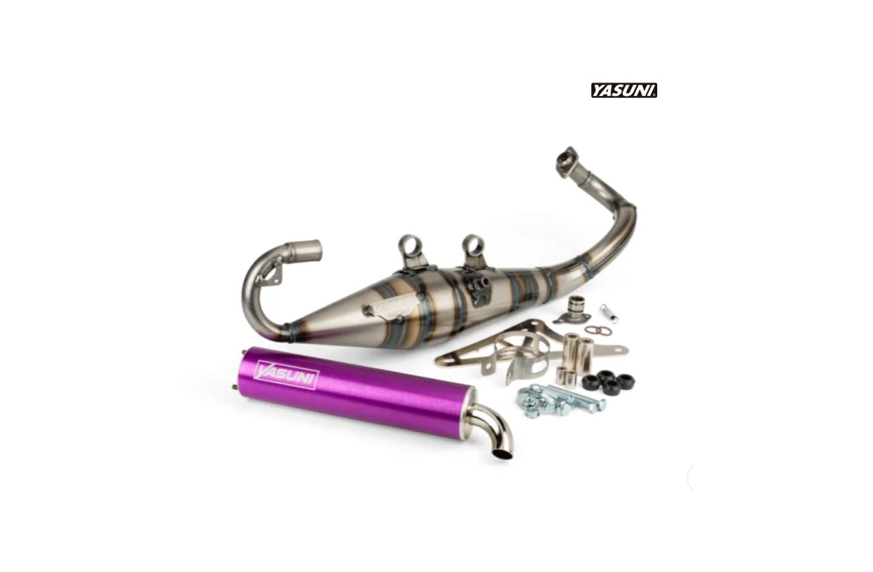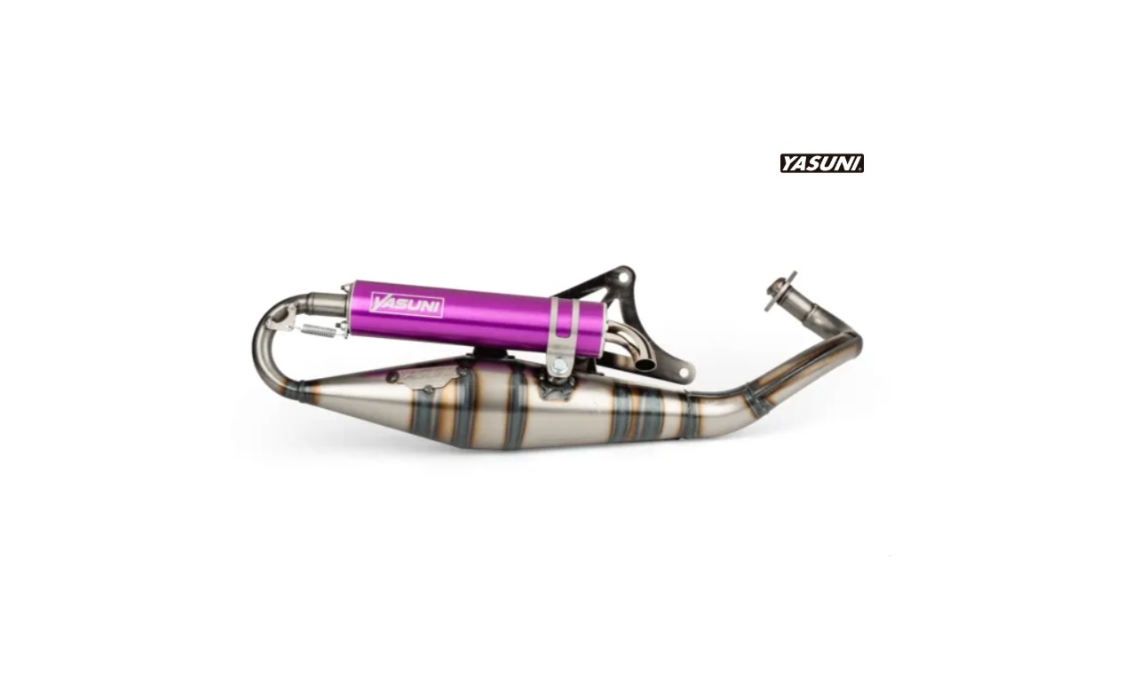 Tubo escape Yasuni R Pro Piaggio silencioso violeta. Este novedoso tubo de escape Yasuni R es válido para todos los motores Piaggio, tanto refrigeración por aire, como por agua, por ejemplo, Piaggio Zip, Gilera, Typhoon, entre otras. Es ideal para motores de 49cc y 70cc. Para un mejor funcionamiento, se recomienda montar con un carburador de 17,5. Este escape está homologado para ITV (contiene certificado de homologación). Con silencioso violeta.