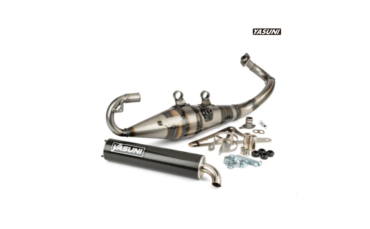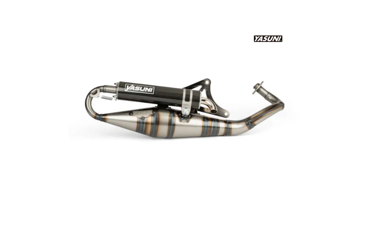 Tubo escape Yasuni R Pro Piaggio silencioso carbono. Este novedoso tubo de escape Yasuni R es válido para todos los motores Piaggio, tanto refrigeración por aire, como por agua, por ejemplo, Piaggio Zip, Gilera, Typhoon, entre otras. Es ideal para motores de 49cc y 70cc. Para un mejor funcionamiento, se recomienda montar con un carburador de 17,5. Este escape está homologado para ITV (contiene certificado de homologación). Con silencioso carbono.